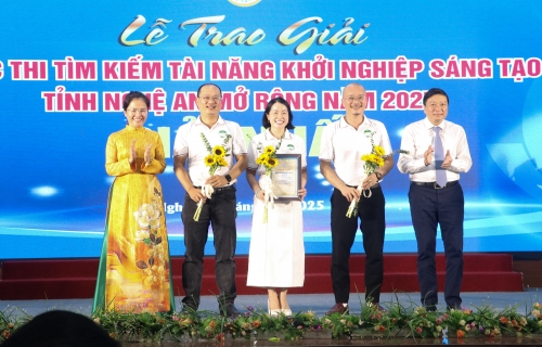 Danh sách các dự án Cuộc thi tìm kiếm tài năng khởi nghiệp sáng tạo tỉnh Nghệ An mở rộng năm 2025 Giải nhất: “Sàn thương mại điện tử ocopai.vn” của nhóm tác giả: Trần Nam Trung, Lê Hiến Mai, Nguyễn Quốc Dưỡng (Công ty TNHH Truyền thông Vinhmedia) Giải nhì: 02 dự án - Dự án “Craftverse - Kết nối tinh hoa, lan toả giá trị thủ công mỹ nghệ” của nhóm tác giả: Võ Uyển My, Nguyễn Đức Phú, Nguyễn Tiến Dũng, Nguyễn Khánh Linh, Nguyễn Hoàng Ngân, Nguyễn Thủy Tiên, Nguyễn Thảo Hà Linh (Nhóm Craftverse). - Dự án “Tin học Trẻ Pro – Nền tảng học lập trình trực tuyến và luyện thi cho học sinh Tiểu học, THCS” của tác giả Nguyễn Như Phùng - Trường Tiểu học 1 Trà Lân. Giải ba: 3 dự án - Dự án “MoneyLog - Quản lý chi tiêu thông minh” của nhóm tác giả: Phan Minh Châu, Nguyễn Thị Phương Chi, Trần Thị Hà Phương (Nhóm MoneyLog). - Dự án “Phát triển robot có kiến trúc ô tô điện phục vụ vận tải thông minh, hướng tới tự động hóa toàn cầu” của nhóm tác giả: Dương Đình Tú, Đinh Văn Nam, Phan Văn Vỹ, Hoàng Văn Đức, Nguyễn Đăng Nghĩa (Trường Đại học Vinh) - Dự án “RÔ-BỐT tự hành vận chuyển hàng” của nhóm tác giả: Nguyễn Ánh Đoan, Vương Đạo Nhân, Nguyễn Xuân Cường, Nguyễn Hồng Hòa, Nguyễn Văn Triển, Lê Văn Nam (Trường Cao đẳng KTCN Việt Nam - Hàn Quốc). Giải khuyến khích: 04 dự án - Dự án “Khơi nguồn đam mê sáng tạo - Nâng tầm giá trị tre làng địa phương” của nhóm tác giả: Nguyễn Thị Hồng Vinh, Phan Thị Thuỷ, Nguyễn Hương Giang, Nguyễn Khánh Duy, Phan Thị Hoài Trang, Nguyễn Đình Thái (Trường THCS Hoàng Tá Thốn, Xã Hợp Minh). - Dự án “Capmedia – Dịch Vụ Thiết kế Video” của tác giả Nguyễn Thị Trà Giang (Trường Đại học Nghệ An). - Dự án “ECODAY- Sống xanh mỗi ngày” của nhóm tác giả: Trần Bình Giang, Trương Thế Anh, Trần Trung Lương, Nguyễn Tuấn Vũ, Trần Bình Minh (Trường Đại học Sư phạm Kỹ thuật Vinh). - Dự án “Vòng tay thông minh chống đuối nước” của nhóm tác giả: Nguyễn Thanh Sơn, Phạm Lê Anh Thư, Nguyễn Tài, Tăng Khánh Ngọc, Đậu Khánh Huyền, Nguyễn Quỳnh Chi (TrườngTHPT chuyên Phan Bội Châu). |