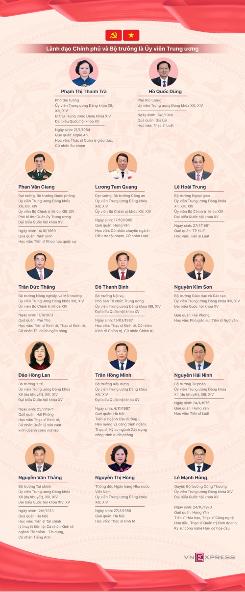 14 thành viên Chính phủ tham gia Ban chấp hành Trung ương khóa 14, trong đó có 2 phó thủ tướng và 12 bộ trưởng, trưởng ngành.