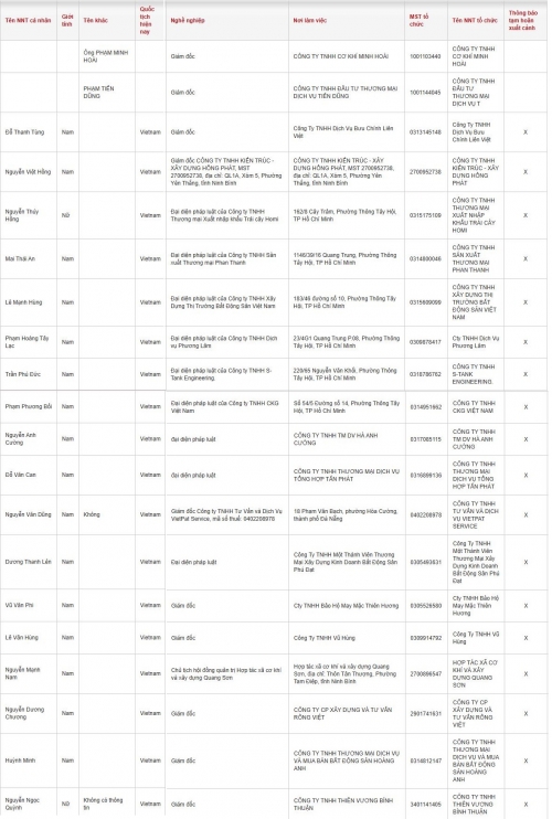 Danh sách các chủ doanh nghiệp bị thông báo tạm hoãn xuất cảnh gồm: