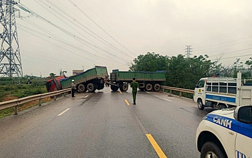 Sau va chạm xe đầu kéo chắn ngang đường. |
