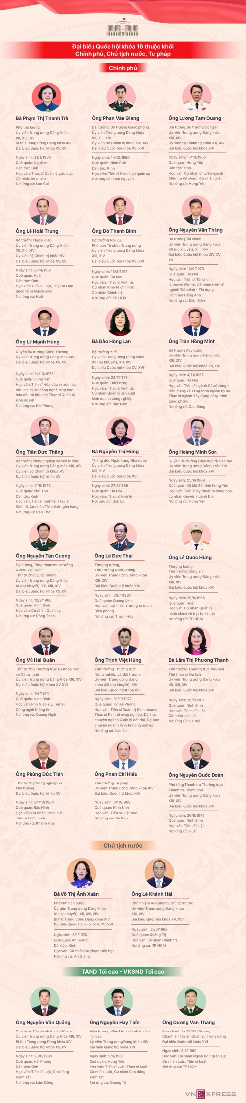 Trong 500 đại biểu Quốc hội khóa 16, khối Chính phủ có 21 người là Bộ trưởng, Thứ trưởng; khối Chủ tịch nước có 2 đại biểu, khối Tòa án nhân dân Tối cao và Viện kiểm sát nhân dân Tối cao có 3 người.