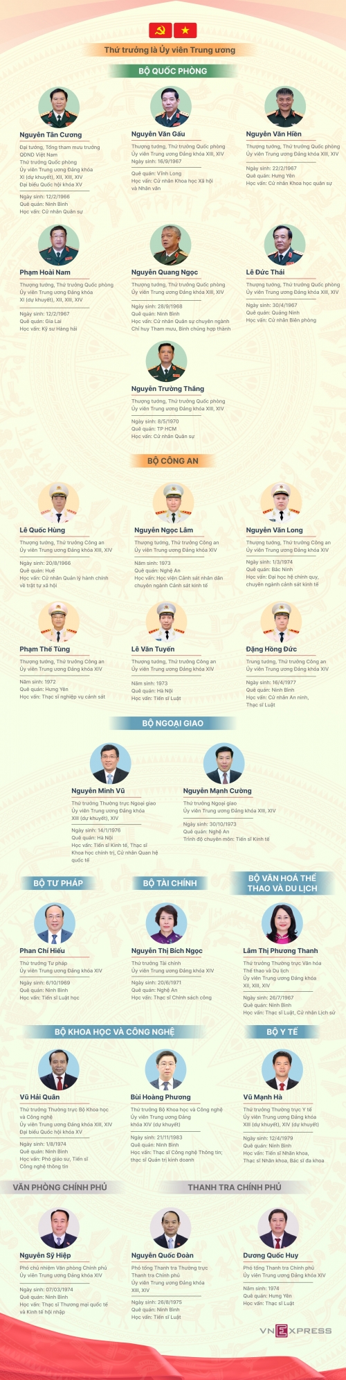 Trong số 24 Thứ trưởng trúng cử Ủy viên Trung ương khóa XIV, Bộ Quốc phòng có 7 người; Bộ Công an 6 người; Bộ Ngoại giao, Khoa học và Công nghệ, Thanh tra Chính phủ mỗi đơn vị 2 người.
