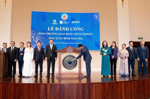 Phiên giao dịch chứng khoán đầu năm 2026 ghi nhận sự hiện diện của giới chức quản lý cấp cao, dẫn đầu là Ủy viên Trung ương Đảng, Bộ trưởng Bộ Tài chính Nguyễn Văn Thắng, cùng Phó Chủ tịch UBND TP.HCM Nguyễn Công Vinh, Phó Thống đốc Ngân hàng Nhà nước Nguyễn Ngọc Cảnh và Chủ tịch Ủy ban Chứng khoán Nhà nước Vũ Thị Chân Phương.