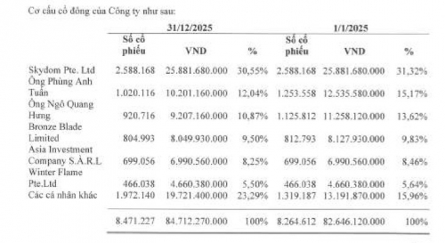 Tại ngày 31-12-2025, Skydom Pte. Ltd vẫn là cổ đông lớn nhất, nắm giữ 30,55% vốn điều lệ, giảm nhẹ so với mức 31,32% đầu năm.