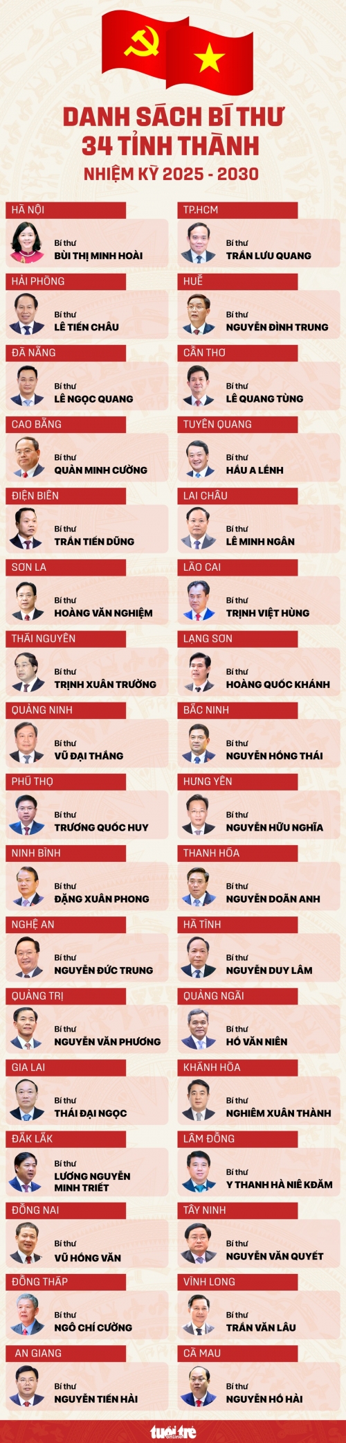 Đồ họa: NGỌC THÀNHTác giả: Ngọc ThànhNguồn tin: Báo Tuổi trẻ TIN LIÊN QUAN Ông Đặng Hồng Sỹ giữ chức Phó Bí thư Thường trực Tỉnh ủy Lâm Đồng Danh sách 34 Bí thư Tỉnh ủy, Thành ủy nhiệm kỳ 2025-2030 Ông Nguyễn Văn Phương được chỉ định làm Bí thư Tỉnh ủy Quảng Trị TIN LIÊN QUAN Ông Đặng Hồng Sỹ giữ chức Phó Bí thư Thường trực Tỉnh ủy Lâm Đồng Danh sách 34 Bí thư Tỉnh ủy, Thành ủy nhiệm kỳ 2025-2030 Ông Nguyễn Văn Phương được chỉ định làm Bí thư Tỉnh ủy Quảng Trị Từ khóa: nhiệm kỳ 2025-2030 ,bí thư thành ủy ,Bí thư tỉnh ủy