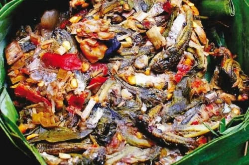 Mok Huak là món ăn có phần “kinh dị” nhất trong danh sách này. Thành phần chính là nòng nọc – nguyên liệu chỉ có vào mùa mưa. Người Thái đem nòng nọc hấp hoặc nướng cùng sả, ớt, rau thơm, rồi gói trong lá chuối. Ảnh centarahotelsresorts |