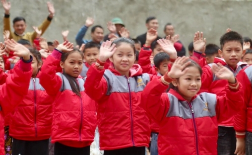 Học sinh miền núi Nghệ An háo hức nhận áo ấm mùa đông - Ảnh: DOÃN HÒA |