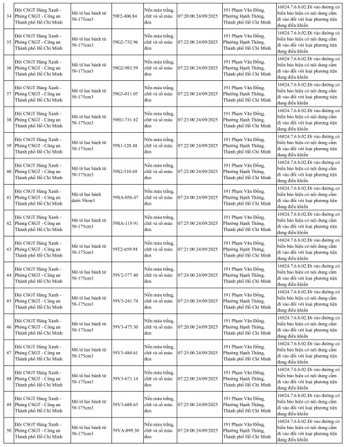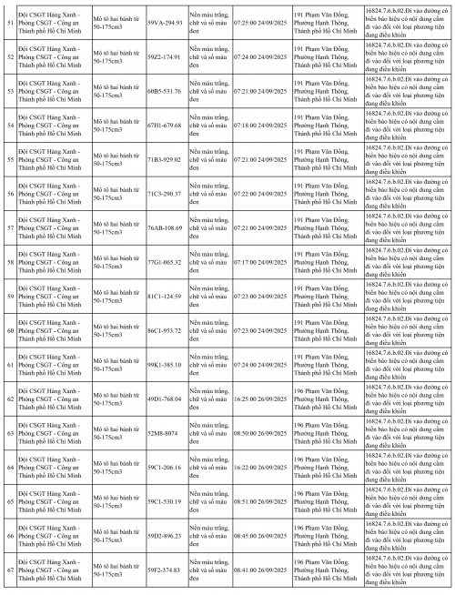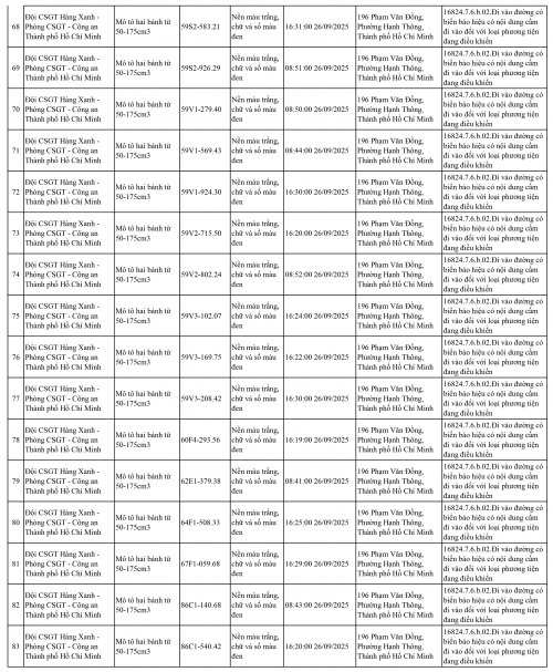 Đội CSGT Hàng Xanh (TP.HCM) thông báo, từ ngày 22/9/2025 đến ngày 26/9/2025 đã ghi hình và gửi thông báo vi phạm đến chủ phương tiện đối với 83 trường hợp vi phạm “Đi vào đường có biển báo hiệu có nội dung cấm đi vào đối với loại phương tiện đang điều khiển” tại khu vực đường ngang Phạm Văn Đồng, phường Hạnh Thông. Danh sách cụ thể như sau: