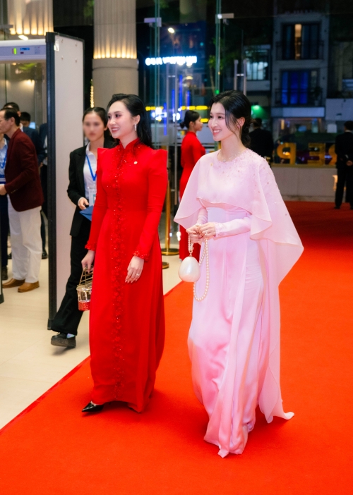 Tại sự kiện, cặp đôi chị em dâu mặc áo dài nền nã, nhan sắc mỗi người một vẻ nhưng có điểm chung là cực xinh.