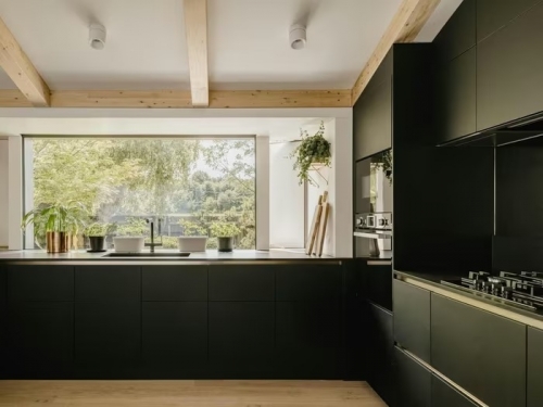 Vật liệu hoàn thiện được lựa chọn theo hướng tiết chế. Khu bếp gồm sàn gỗ sồi, hệ bếp sơn đen và thiết bị bếp đồng bộ. Ảnh: James Retief |
