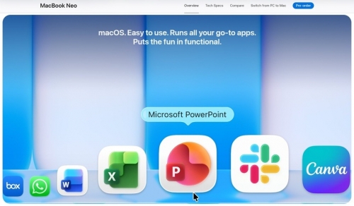 Apple đặt các biểu tượng Word, Excel và PowerPoint nổi bật ngay trên trang chủ của MacBook Neo. Ảnh: Apple. |