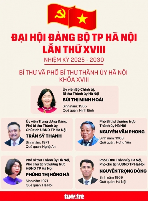 1. Bà Bùi Thị Minh Hoài - Ủy viên Bộ Chính trị, Bí thư Thành ủy Hà Nội, Trưởng Đoàn đại biểu Quốc hội TP Hà Nội khóa XV, Bí thư Đảng ủy Bộ Tư lệnh Thủ đô - tiếp tục được bầu giữ chức Bí thư Thành ủy Hà Nội.