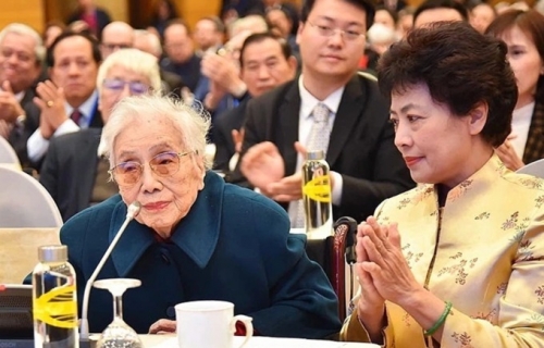 Bà Nguyễn Thị Bình (trái) phát biểu tại lễ kỷ niệm 50 năm ngày ký Hiệp định Paris, ở Hà Nội tháng 1/2023. Ảnh: BNG |