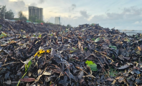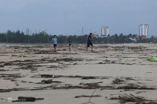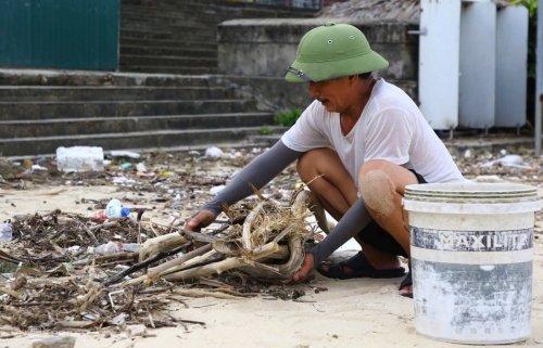 Ông Trần Văn Tân, chủ cơ sở dịch vụ ven biển, cho biết rác tấp dày đặc sau bão. Gia đình ông ba ngày nay dọn từ sáng đến tối mà vẫn không xuể. "Dọn hôm nay xong thì tối rác lại tấp vào, nhưng để bán hàng thì phải dọn sạch", ông giải thích. |