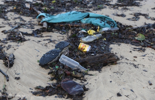 Ngoài rác hữu cơ còn có rác khó phân hủy như bao bì nylon, vỏ chai nhựa nằm trên bãi cát. |