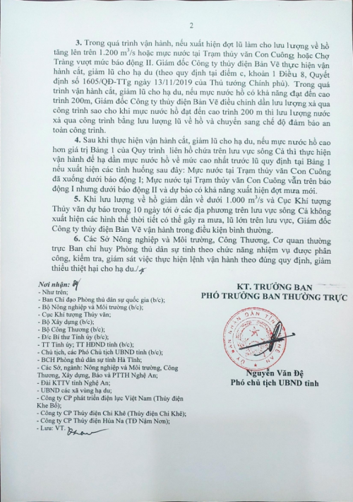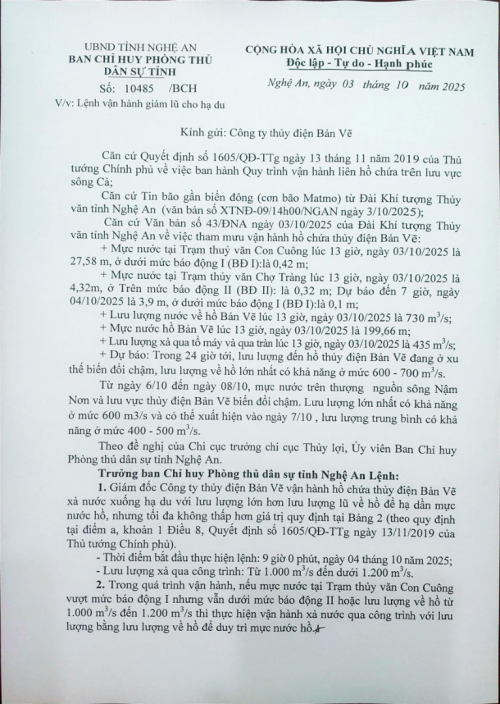 Ngày 3/10/2025, Ban Chỉ huy Phòng thủ dân sự tỉnh Nghệ An đã ban hành Văn bản số 10485/BCH về việc Lệnh vận hành giảm lũ cho hạ du. Để phù hợp với diễn biến của mưa lũ, tình hình ngập úng phía hạ du lưu vực sông Cả trên địa bàn tỉnh, Ban Chỉ huy Phòng thủ dân sự tỉnh thay đổi thời gian thực hiện lệnh tại Văn bản số 10485/BCH ngày 3/10/2025, cụ thể như sau: