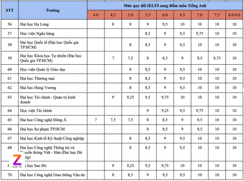 Mức quy đổi điểm mỗi trường cũng khác nhau. Có trường cho phép thí sinh đạt IELTS 6.5 được tính điểm tối đa (10 điểm), trong khi một số trường yêu cầu từ 7.5 đến 8.0 mới đạt mức cao nhất.