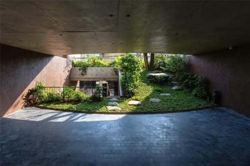 Những lớp chuyển tiếp này - từ ngoài vào trong, từ tầng trệt lên tầng trên - tạo một thể thống nhất liền mạch. Ảnh: Triệu Chiến |