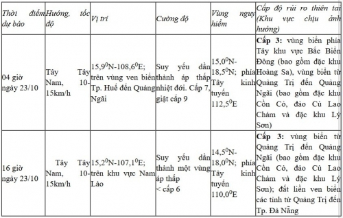 - Vùng biển từ Quảng Trị đến Quảng Ngãi (bao gồm đặc khu Cồn Cỏ, đảo Cù Lao Chàm và đặc khu Lý Sơn) có gió mạnh cấp 6-7, vùng gần tâm bão đi qua cấp 8, giật cấp 10, sóng biển cao 3,0-5,0m, biển động mạnh.