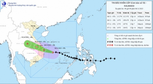 Theo Cục Khí tượng Thủy văn, đêm qua và sáng sớm nay (6-11), bão số 13 Kalmaegi, di chuyển theo hướng Tây Tây Nam, tốc độ khá nhanh, khoảng 30km/giờ.