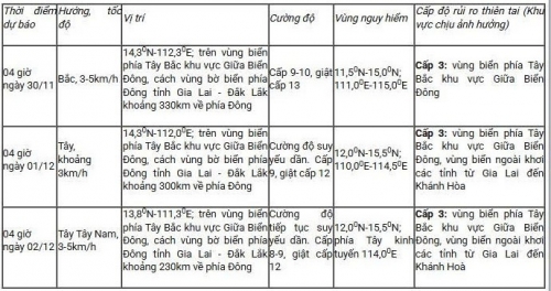 Vùng biển ngoài khơi từ Gia Lai đến Khánh Hòa xuất hiện gió mạnh cấp 6-7, sau tăng lên cấp 8, giật cấp 9-10; sóng cao 4-6 m, biển động mạnh.