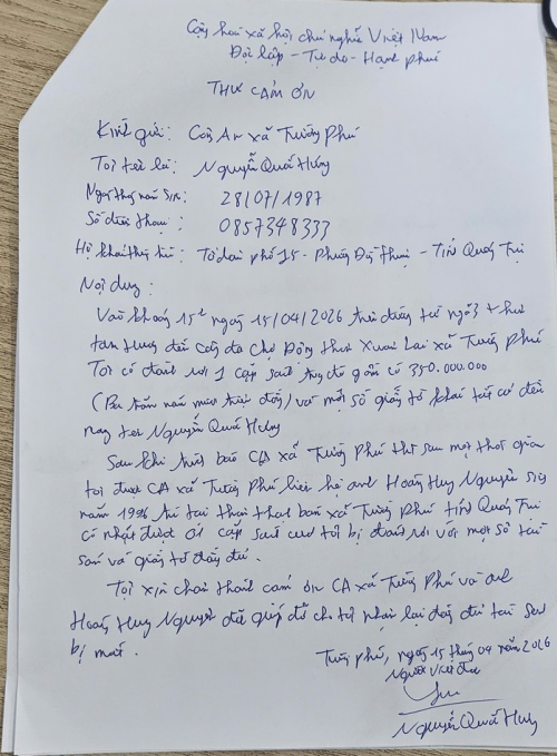 Trước đó, anh Nguyễn Quốc Hưng (SN 1987, trú phường Đồng Thuận) trình báo với công an về việc chiều 15-4, khi di chuyển từ ngã ba thôn Tam Hương đến ngã năm thôn Xuân Lai (xã Trường Phú), anh bất cẩn làm rơi một chiếc cặp màu đen. Bên trong có khoảng 350 triệu đồng cùng nhiều giấy tờ quan trọng.