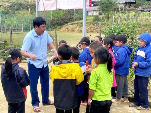 Một thầy giáo tiểu học tại xã Nhôn Mai mang theo bánh kẹo vào bản để thuyết phục học sinh trở lại lớp |