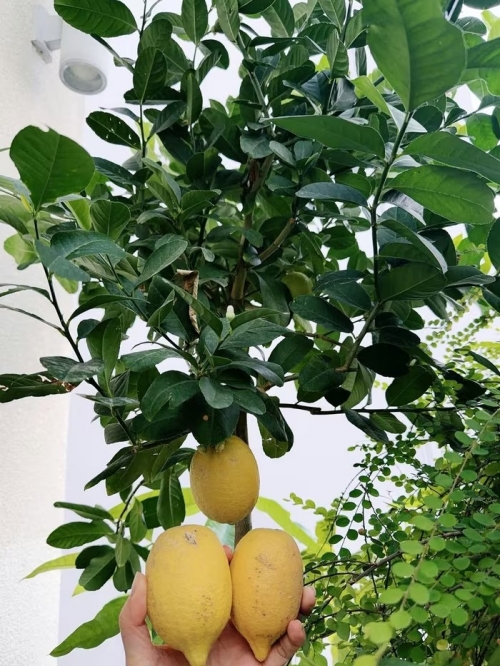 Giáng My hào hứng khoe thành quả hái chanh vàng trong vườn nhà. Ảnh: FB Giáng My |