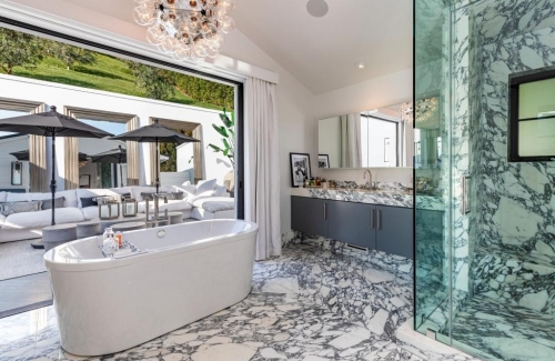 Phòng ngủ chính (primary suite) có phòng tắm đá cẩm thạch sang trọng dành cho cả hai, với bồn tắm lớn, cùng phòng thay đồ và tủ quần áo walk-in khổng lồ.