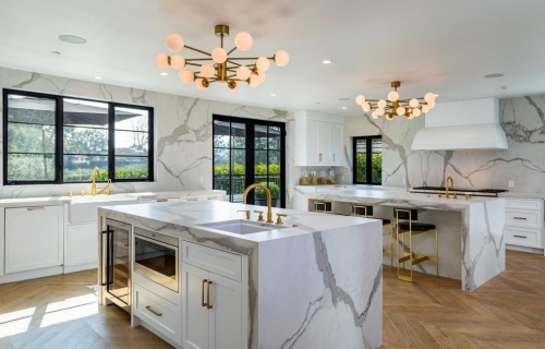 Nhà bếp dành cho đầu bếp chuyên nghiệp trong biệt thự trông như bước ra từ giấc mơ với mặt bàn đá cẩm thạch trắng tinh, sàn gỗ xếp kiểu xương cá, cùng hai đảo bếp lớn, mỗi đảo đều có bồn rửa với phụ kiện mạ vàng.