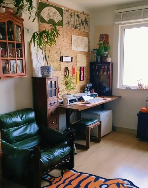 Khu vực làm việc kết hợp thêm các yếu tố truyền thống như mây tre, tranh thủy mặc, thư pháp... tạo không gian mang đậm dấu ấn cá nhân. Ảnh: Xiaohongshu |