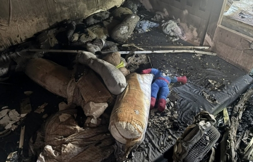 Bên trong khói đen ám đầy các bức tường, trần nhà bị đổ sập, nhiều vật dụng trong nhà bị cháy đen. Quán bún ốc vừa là nơi kinh doanh vừa là nơi ở của nhiều người trong gia đình, trong đó có cả nhân viên quán. Chiếc giường còn chứa các vật dụng, đồ chơi của 2 đứa trẻ bị cháy, ám khói.