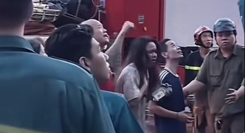 Hình ảnh người thân chờ đưa những người mắc kẹt trong đám cháy ra ngoài. |