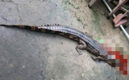 Con cá sấu do ông T. nuôi nhốt bị xổng chuồng cắn người bị thương. |