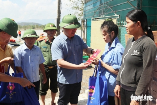 Ông Nguyễn Đức Trung - Bí thư Tỉnh ủy Nghệ An - tặng quà cho người dân vùng bão lũ xã Bích Hào, Nghệ An - Ảnh: DOÃN HÒA |