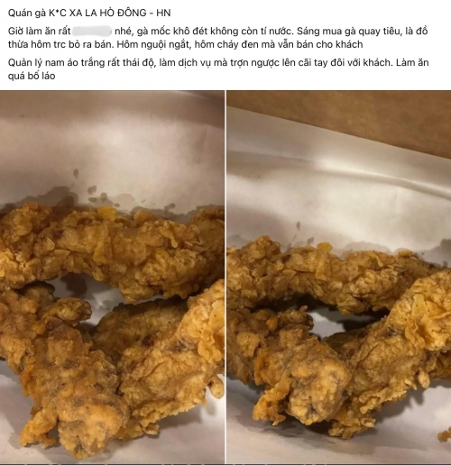 Người đăng còn cho biết một số miếng gà xuất hiện dấu hiệu bất thường như bề mặt khô cứng, nghi bị mốc hoặc để lâu, không còn độ tươi. Ngoài ra, họ phản ánh tình trạng gà khi mua về có lúc bị nguội, thậm chí có miếng bị cháy đen nhưng vẫn được bán cho khách, làm dấy lên nghi vấn về việc cửa hàng không đảm bảo quy trình bảo quản và kiểm soát chất lượng thực phẩm.