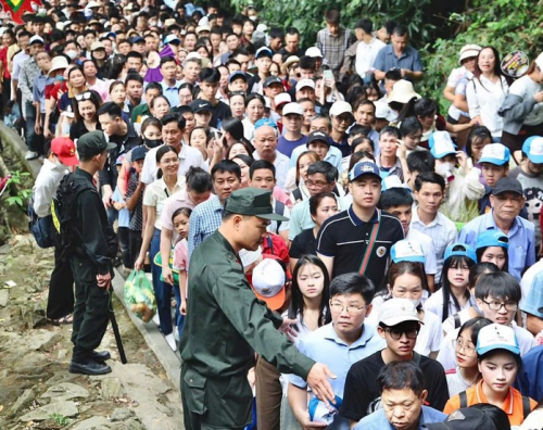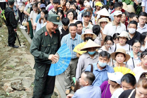 Lượng khách đổ về Đền Hùng tăng đột biến trước ngày Giỗ Tổ, Công an tỉnh Phú Thọ hướng dẫn người dân không chen lấn, xô đẩy và tận tình giúp đỡ người già, trẻ nhỏ. Đồng thời tổ chức phát nước, sữa miễn phí phục vụ du khách.