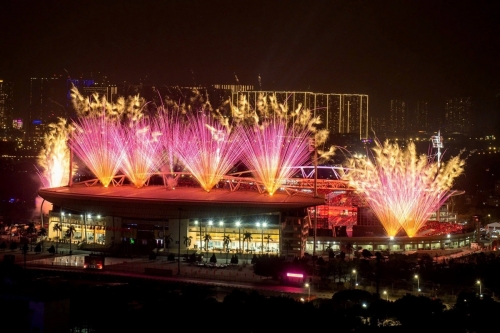 Bên cạnh phần khai hỏa chính thức, pháo hỏa thuật tầm thấp và pháo tầm cao được kích hoạt xuyên suốt các màn biểu diễn của nghệ sĩ. Thời lượng kéo dài 15-45 giây để giữ nhịp thị giác liên tục cho người xem. Ảnh: Sun Group |