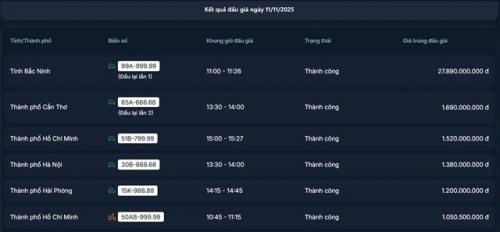 Theo thông tin từ Công ty Đấu giá Hợp danh Việt Nam (VPA) và Cục CSGT (Bộ Công an), tâm điểm của phiên đấu giá ngày 11/11 là biển số 99A-999.99. Trong khung giờ 11:00 - 11:26, biển số ô tô của tỉnh Bắc Ninh đã chính thức được chốt với mức giá trúng cuối cùng là 27,89 tỷ đồng.