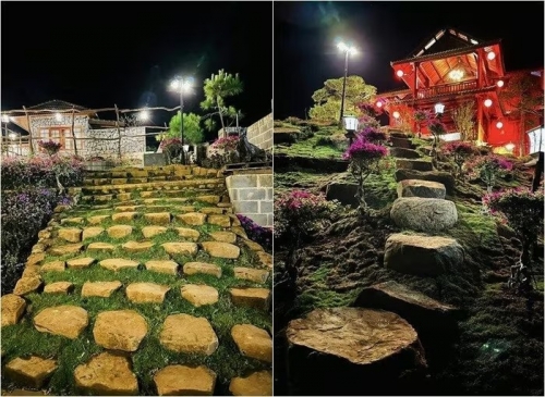 Toàn bộ lối đi trong khuôn viên đều được lót đá tự nhiên, xen kẽ là thảm cỏ xanh mướt. Ảnh: FBNV |