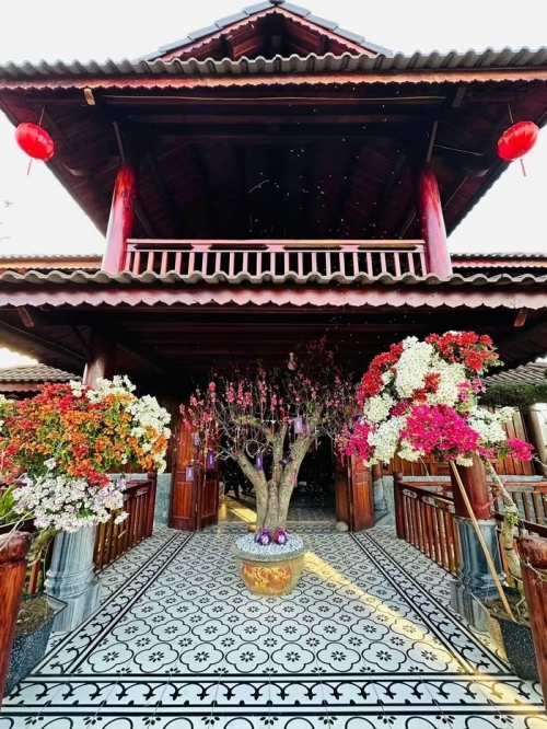 Kiến trúc chủ đạo của ngôi nhà mang phong cách truyền thống với mái ngói âm dương, hệ cột gỗ lớn. Ảnh: FBNV |