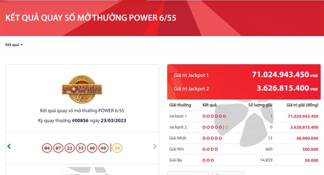 Tối 23/3, tại kỳ quay số mở thưởng lần thứ 856 của loại hình xổ số tự chọn Power 6/55, Công ty Xổ số Điện toán Việt Nam (Vietlott) tìm thấy 1 tấm vé trúng giải Jackpot 1 trị giá 71 tỷ đồng.