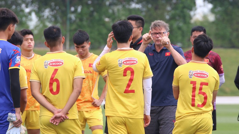 Ông Troussier động viên các cầu thủ trước trận đấu gặp U23 Kyrgyzstan tranh hạng 9-10.