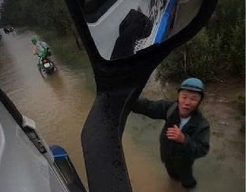 Xe chết máy giữa biển nước, cha già vẫy ôtô xin cho con trai đi nhờ