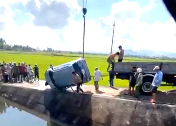 Thi thể đôi nam, nữ cùng chiếc xe 5 chỗ vừa được người dân phát hiện dưới nước thuộc khu vực đập dâng Vân Phong, tỉnh Gia Lai.