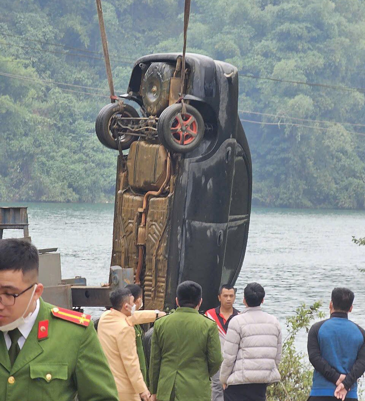 Quá trình trục vớt xe ô tô dưới lòng hồ thủy điện Hòa Bình, lực lượng chức năng phát hiện bên trong xe có một thi thể nam giới.