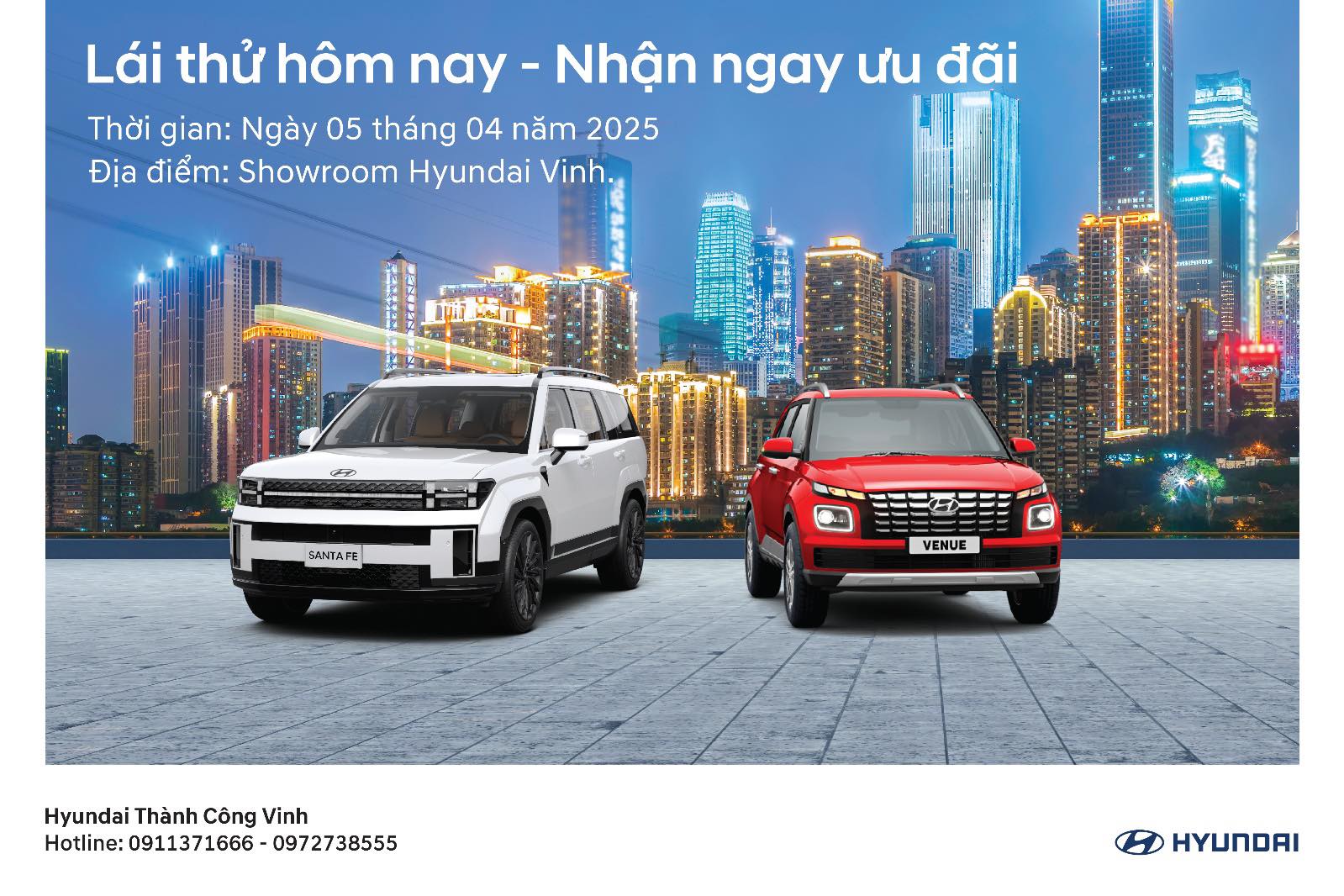 Nhân dịp đạt được các giải thưởng xuất sắc trong lĩnh vực marketing năm 2024, Hyundai Vinh đã tổ chức chuỗi sự kiện đặc biệt nhằm tri ân khách hàng và khẳng định vị thế của mình trên thị trường. Sự kiện "Lái thử hôm nay - Nhận ngay ưu đãi" sẽ được diễn ra vào Thứ 7, ngày 5/4/2025, từ 8h đến 16h tại Showroom Hyundai Vinh.