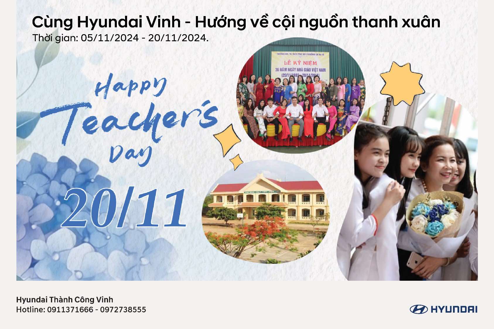 Nhân dịp ngày Nhà giáo Việt Nam 20/11, Hyundai Vinh tổ chức chương trình tri ân khách hàng mang tên “Cùng Hyundai Vinh – Hướng về cội nguồn thanh xuân” với mục đích tôn vinh những người thầy, người cô và gợi nhớ lại những ký ức thanh xuân đẹp đẽ về mái trường xưa.