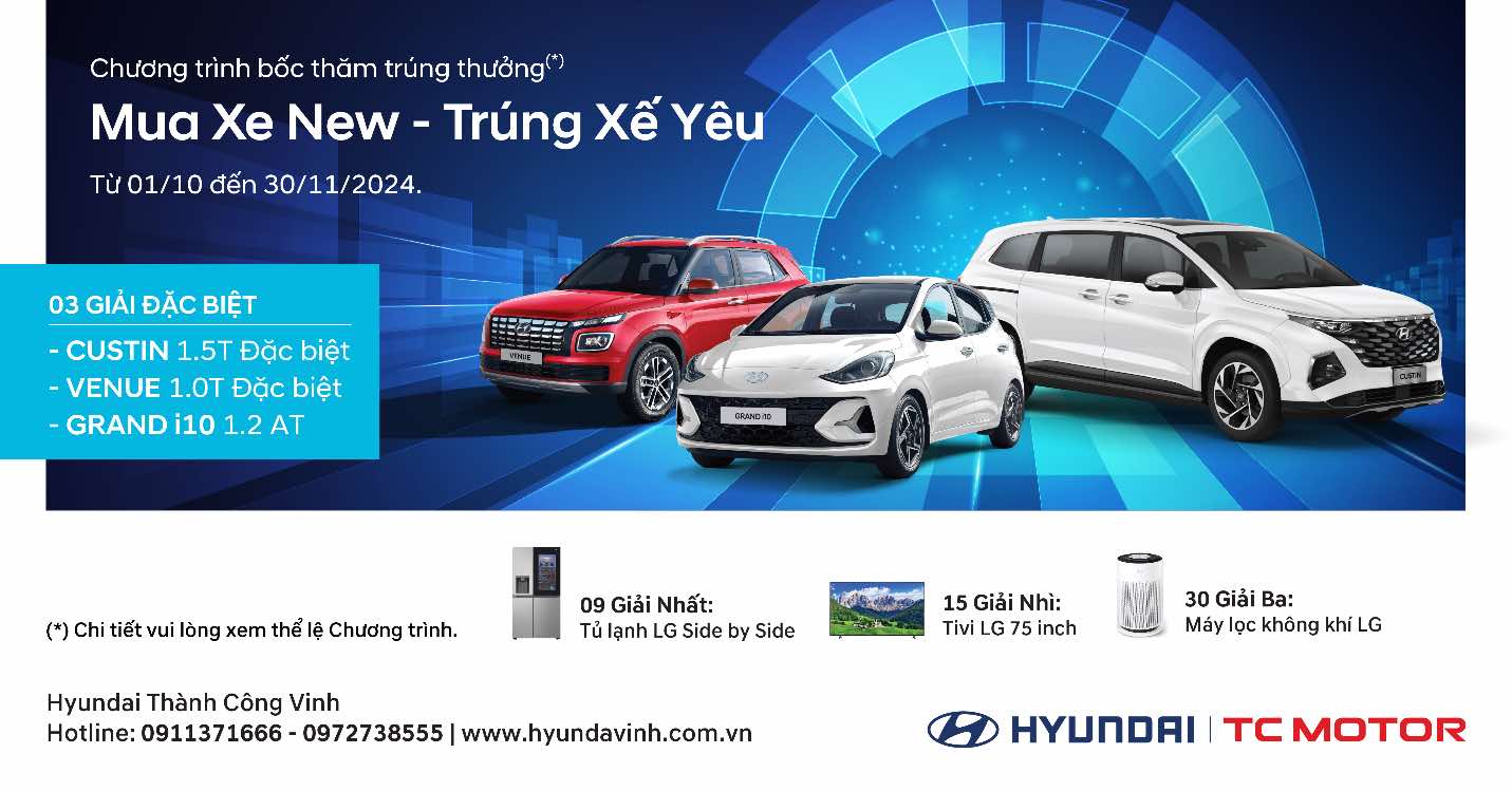 Hyundai Vinh tự hào giới thiệu chương trình khuyến mãi đặc biệt mang tên "Mua xe new - Trúng xế yêu", mang đến cơ hội vàng cho khách hàng sở hữu những mẫu xe Hyundai yêu thích và có cơ hội nhận xe miễn phí.