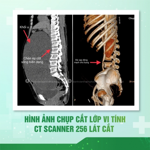 Tại đây, hình ảnh đầu tiên gây ấn tượng với các bác sĩ là chiếc bụng của bà phình to như phụ nữ mang thai 8 tháng, căng cứng. Kết quả chụp CT-Scanner 256 lát cắt cho thấy một khối u nang buồng trứng khổng lồ chiếm trọn ổ bụng, chèn ép gây xẹp động mạch chủ bụng, các cơ quan bị đẩy lệch vị trí, niệu quản bị ép gây giãn đài bể thận hai bên và thậm chí làm biến dạng cột sống.
